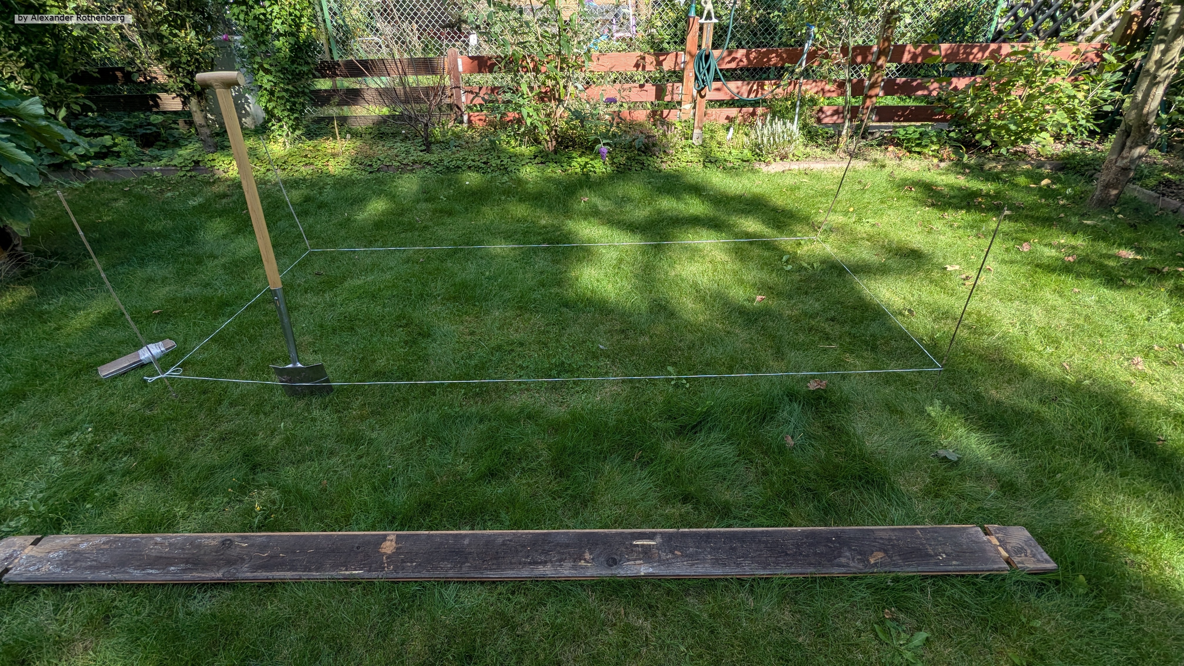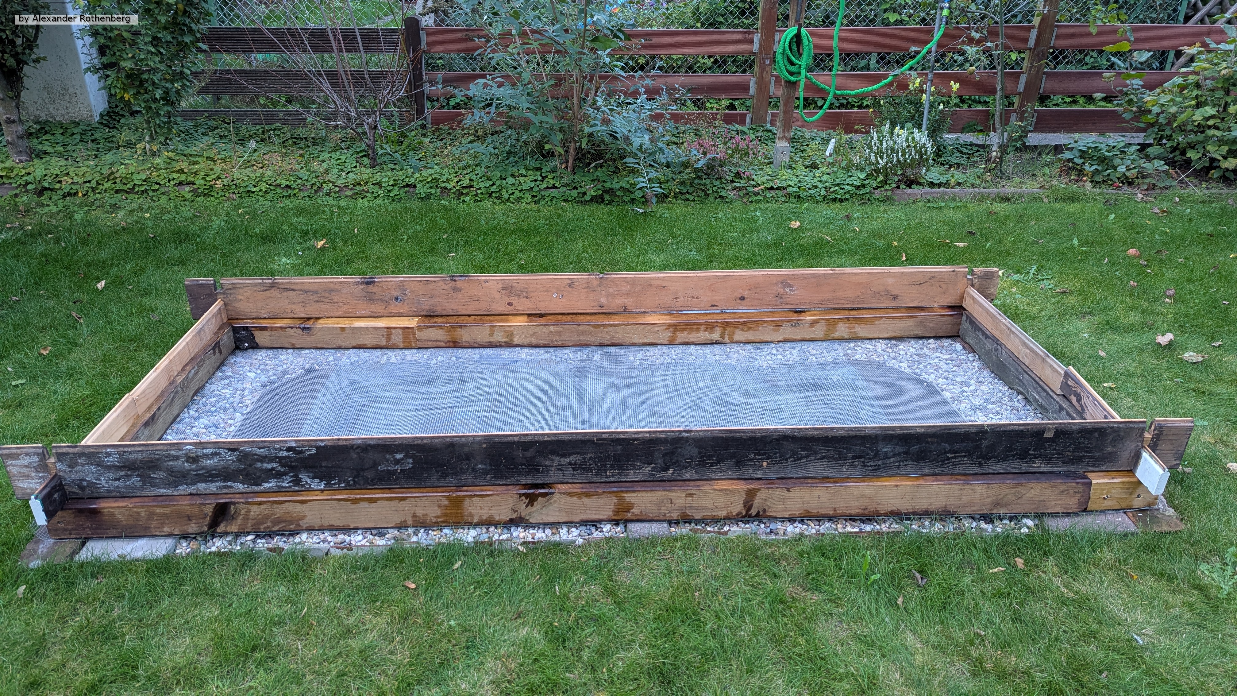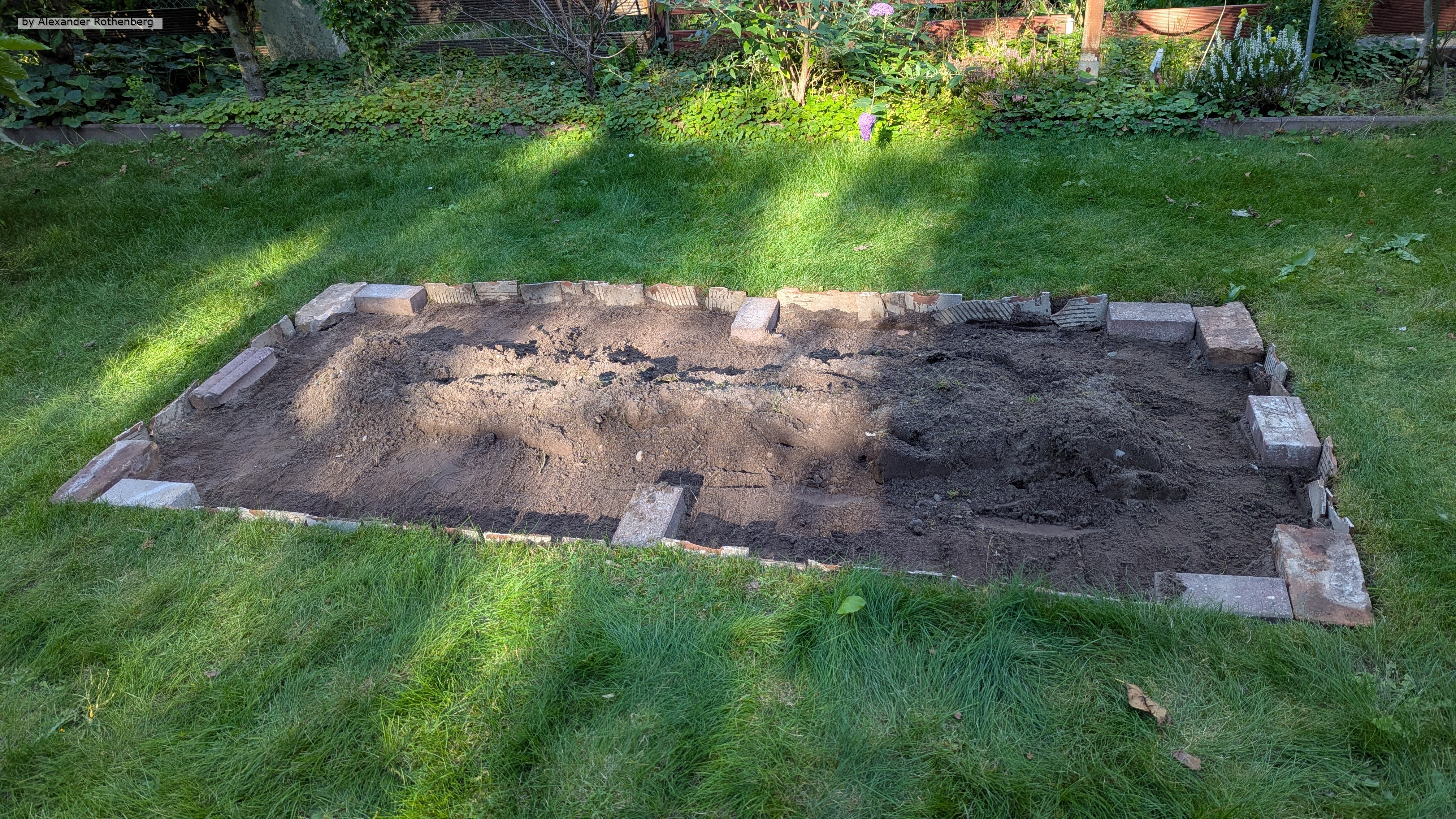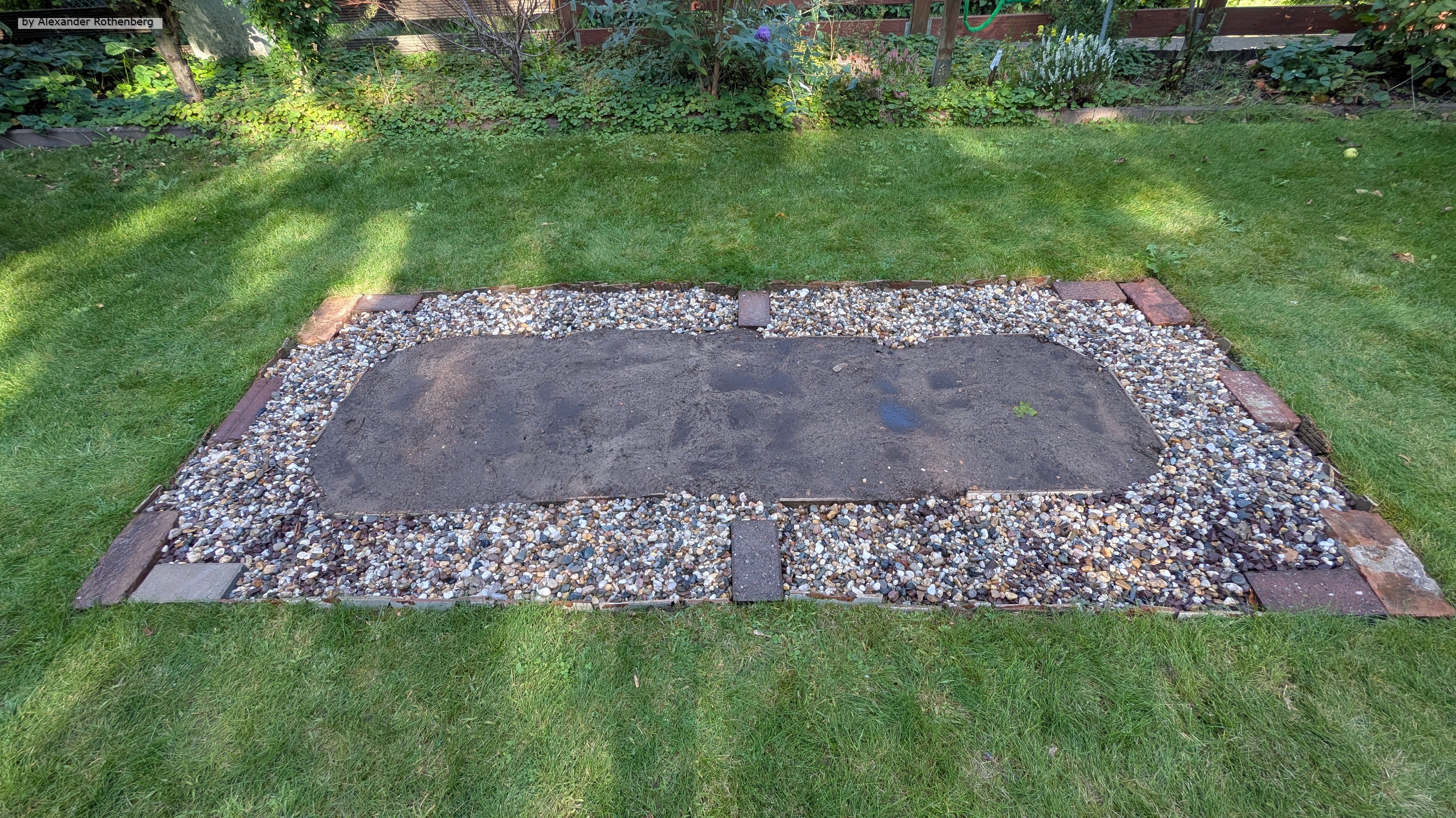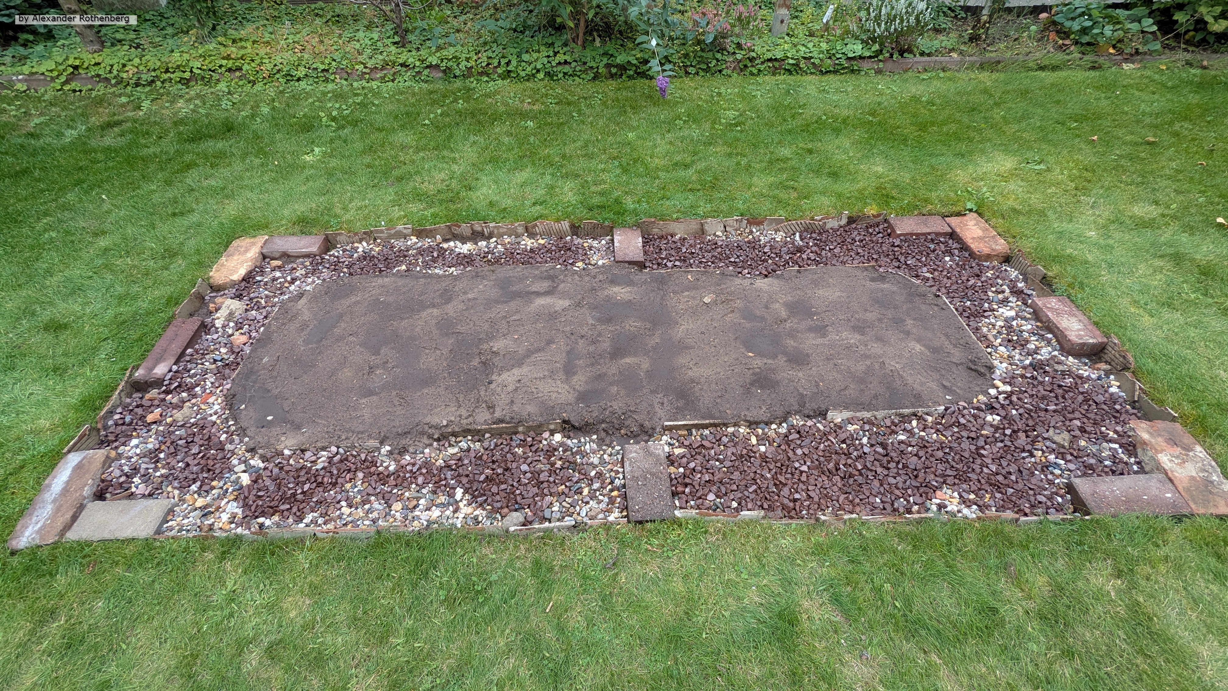 Und da ich noch genug Platz, Material und Kapazitäten hatte, setzte ich das Projekt dieses Mal etwas schneller um. Holz war noch genug vom Hüttenabriss vorhanden und einige Materialien wie Drainagekies und Noppenfolie war noch vom ersten Hochbeet über. So machte ich mich dann ans Ausmessen der Fläche und schuf ein Fundament wie beim ersten Hochbeet: Im äußeren Ring platzierte ich einige Ziegelsteine, auf denen später der Rahmen aufliegen soll. Dazwischen füllte ich Kies auf und umrandete alles mit alten Fliesen.