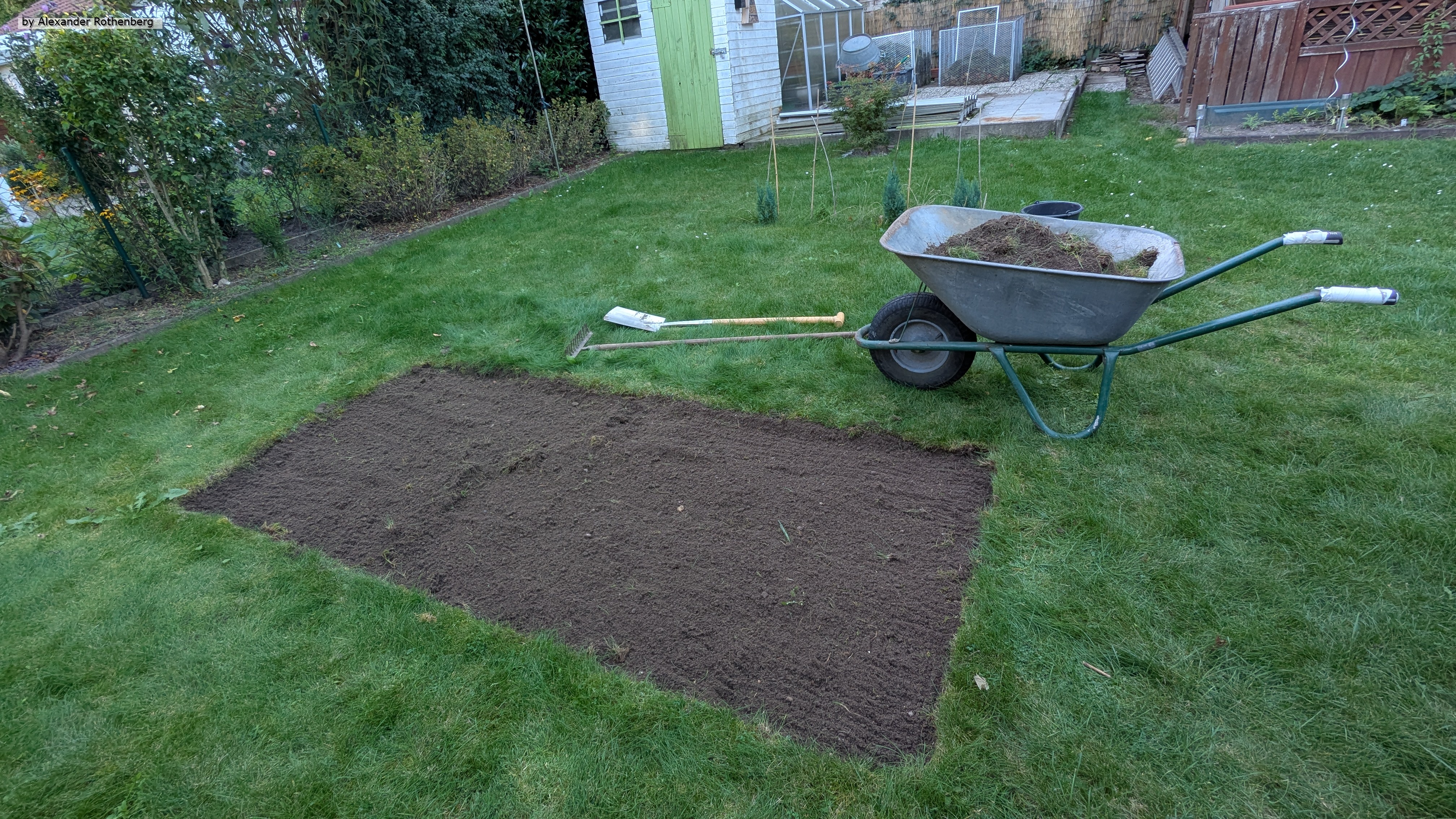 Nun kam der wirklich schwere Teil des Befüllens vom Hochbeet. Wie beim ersten Hochbeet hatte ich den Boden mit groben Holzästen und Zweigen bedeckt. Anschließend kam die volle Ladung Kompost aus teilweise gut und noch nicht verrotteten Grünschnitt herein. Die letzte Schicht stammte aus Resterde, welche immer mal wieder im Garten angefallen war und schließlich noch zugegebenermaßen 140 Liter zugekaufte Hochbeeterde.