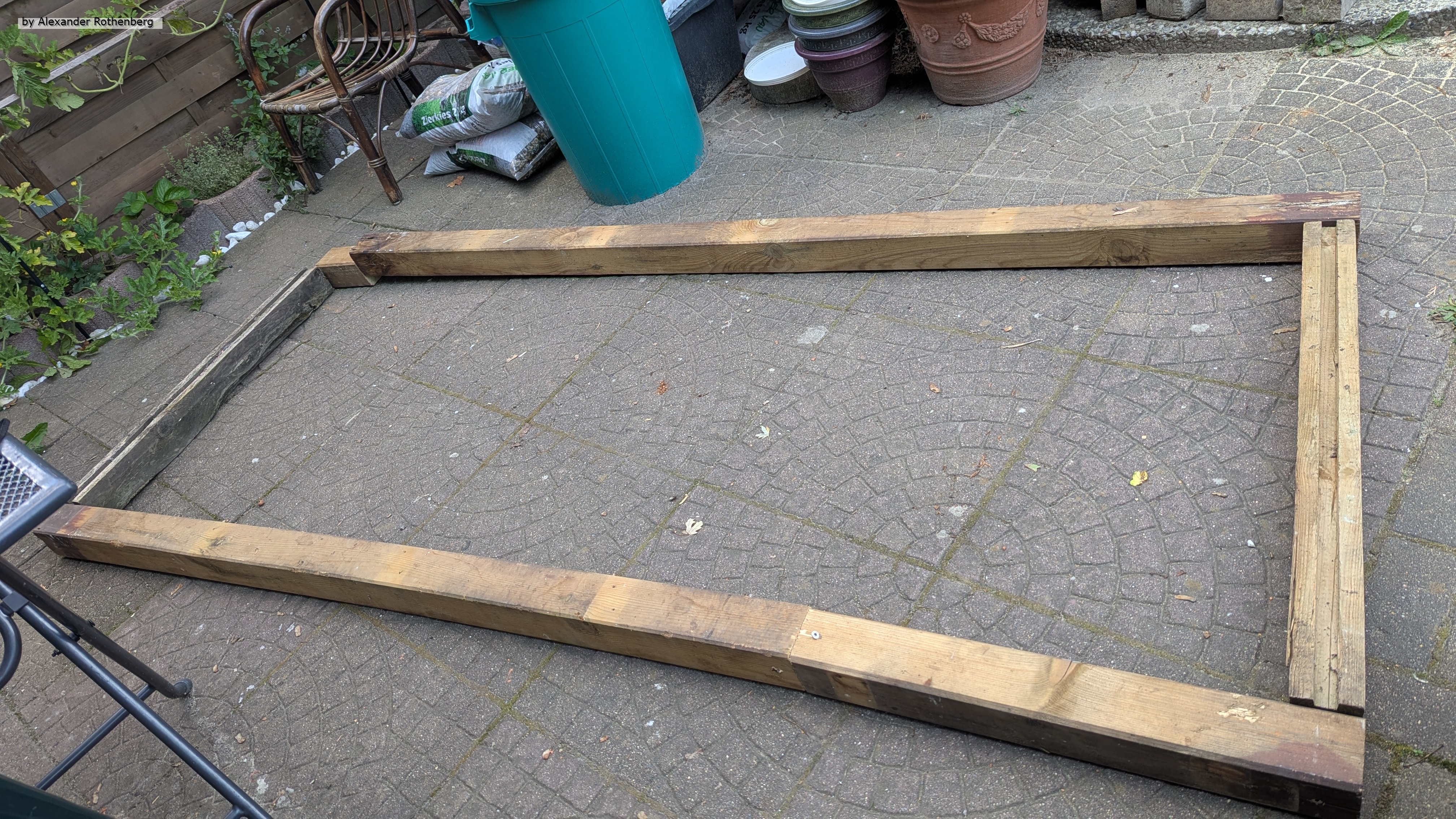 Zeitgleich mit dem Fundament fertigte ich den Rahmen welcher aus übrig gebliebenen Balken vom Abriss entstand. Da einer der Balken kürzer war, musste ich ihn aus zwei Teilen zusammensetzen.