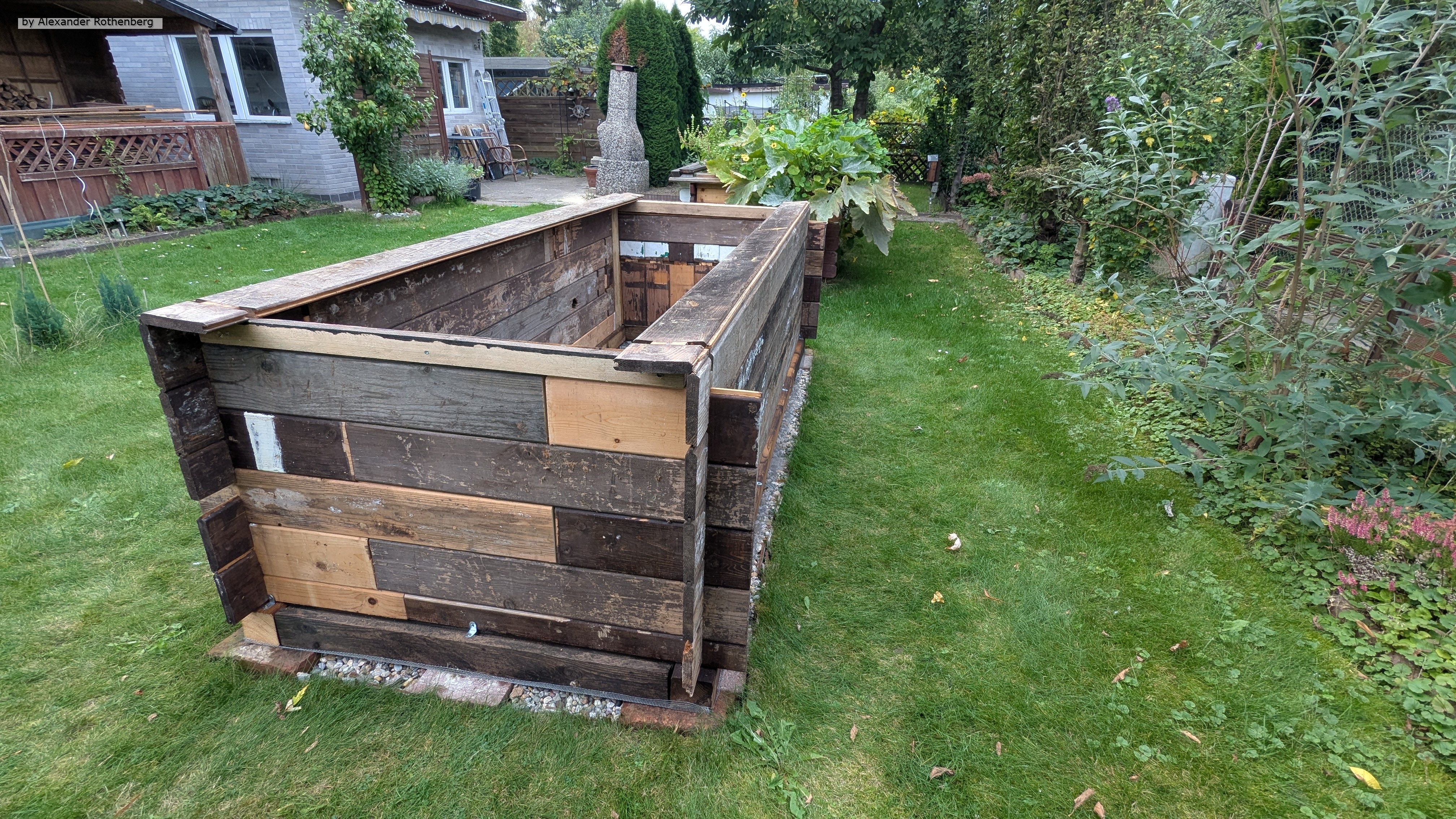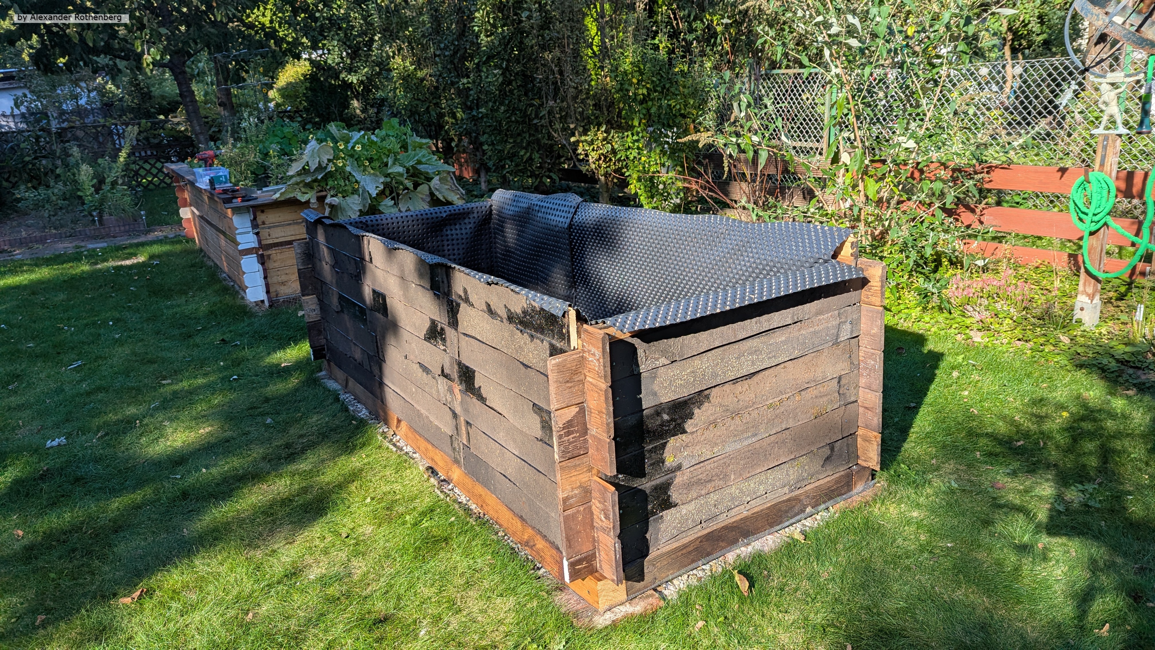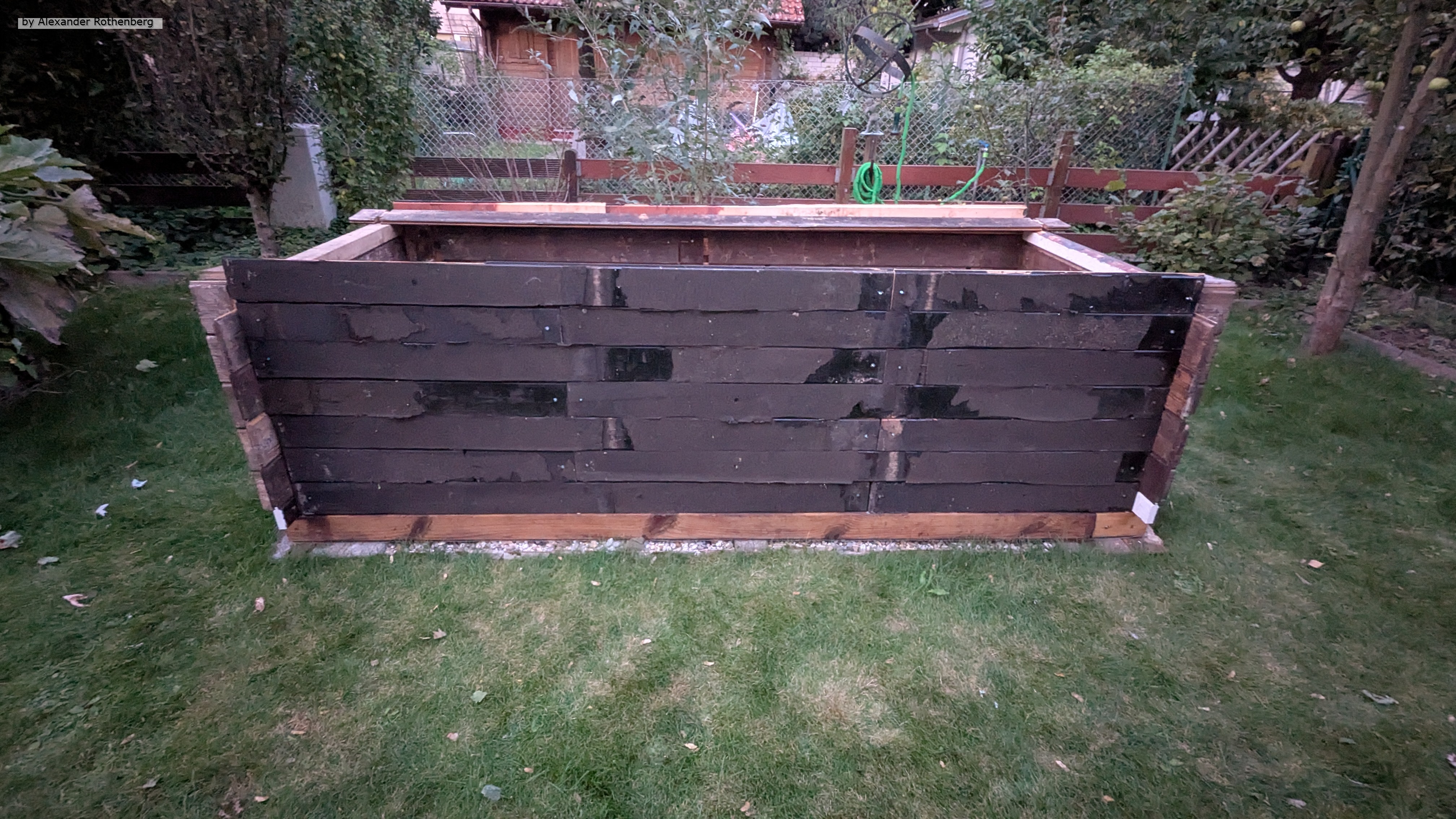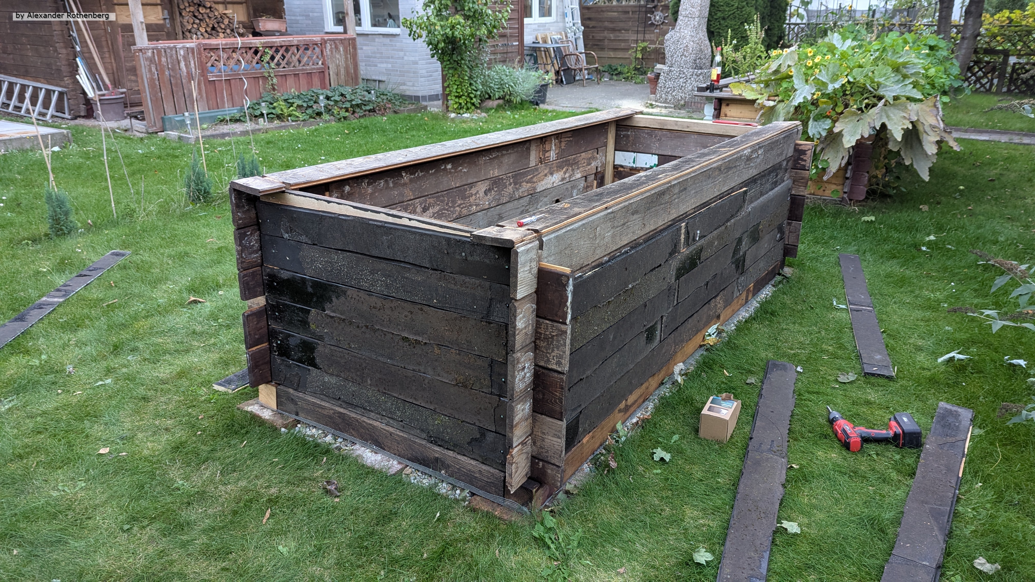 Da die äußere Holzwand aber schon deutliche Witterungsschäden aufwies, baute ich außen noch eine dritte Schicht aus witterungsbeständigen Dachlatten an. Diese waren bereits geteert und teilweise noch mit Dachpappe überzogen. Machte das Hochbeet jetzt nicht unbedingt hübscher aber hoffentlich langlebiger 😂.