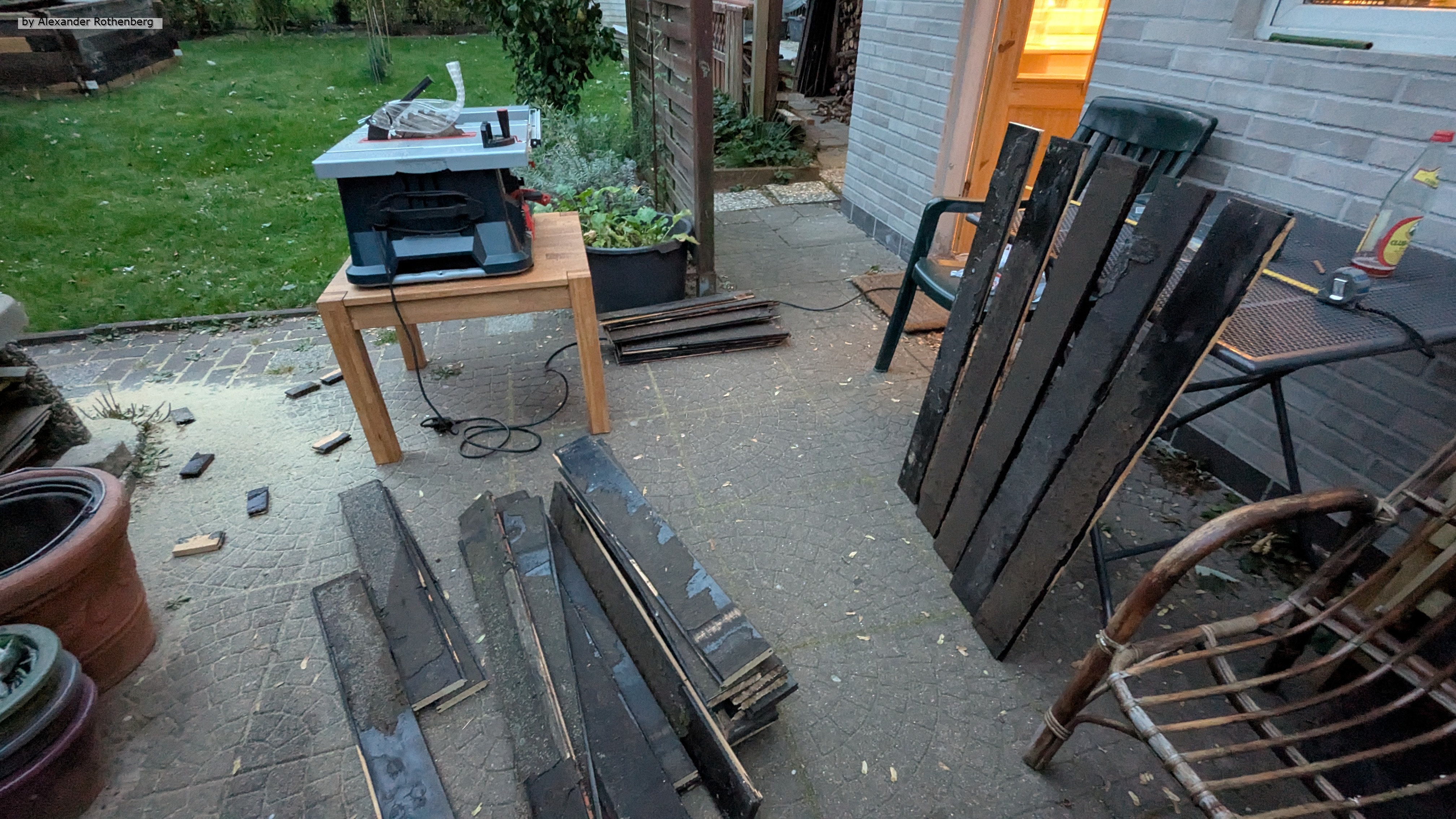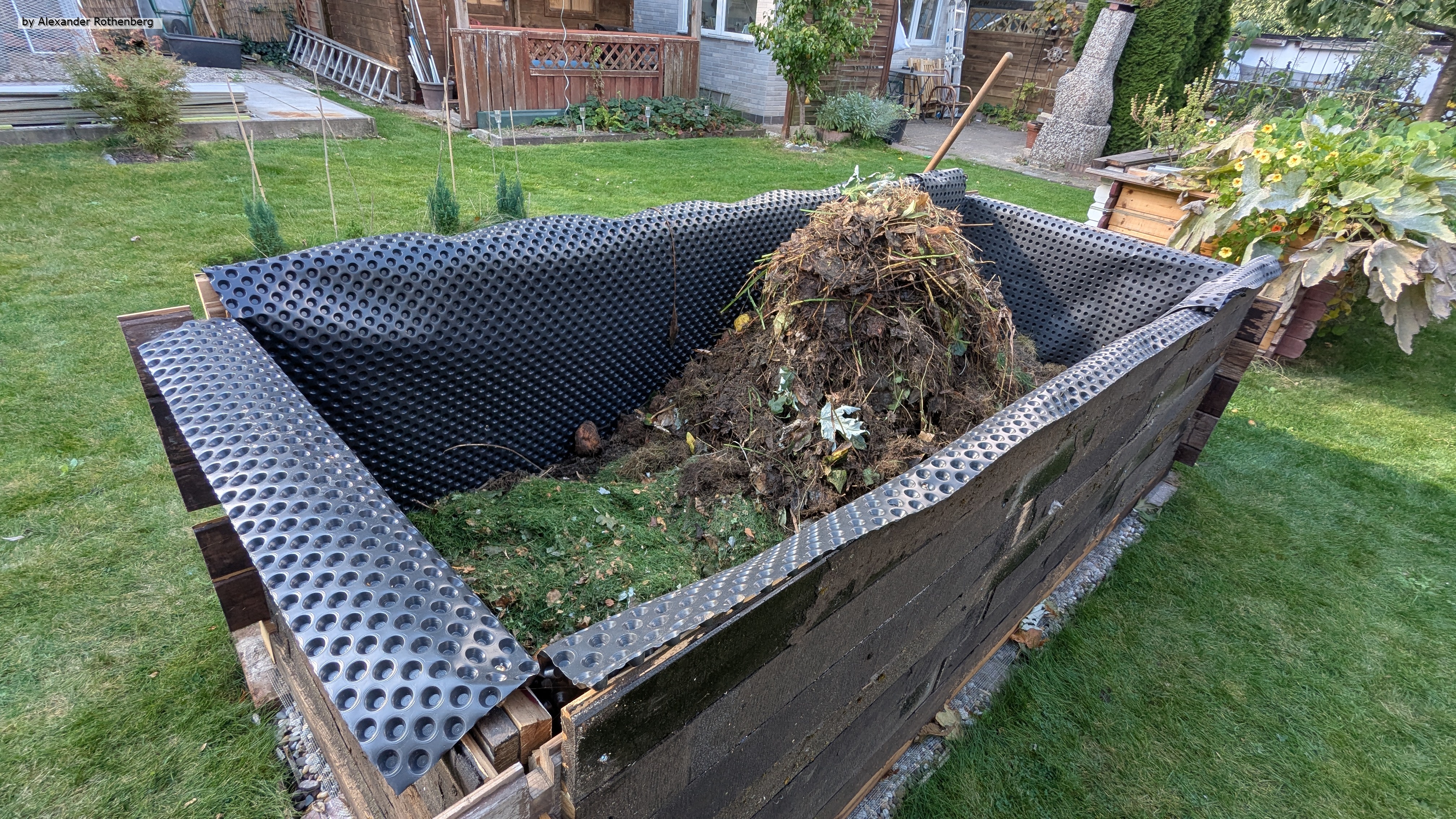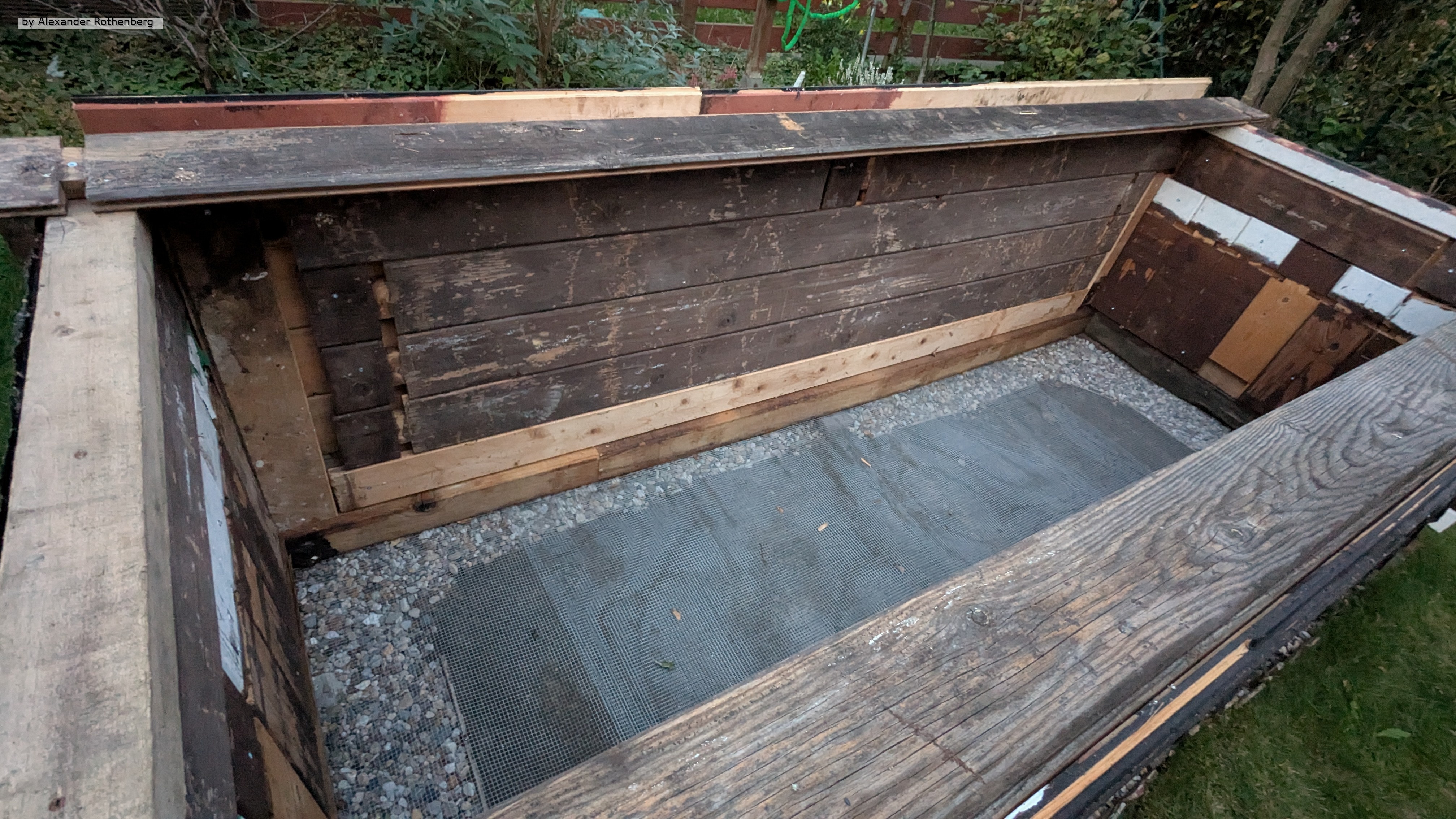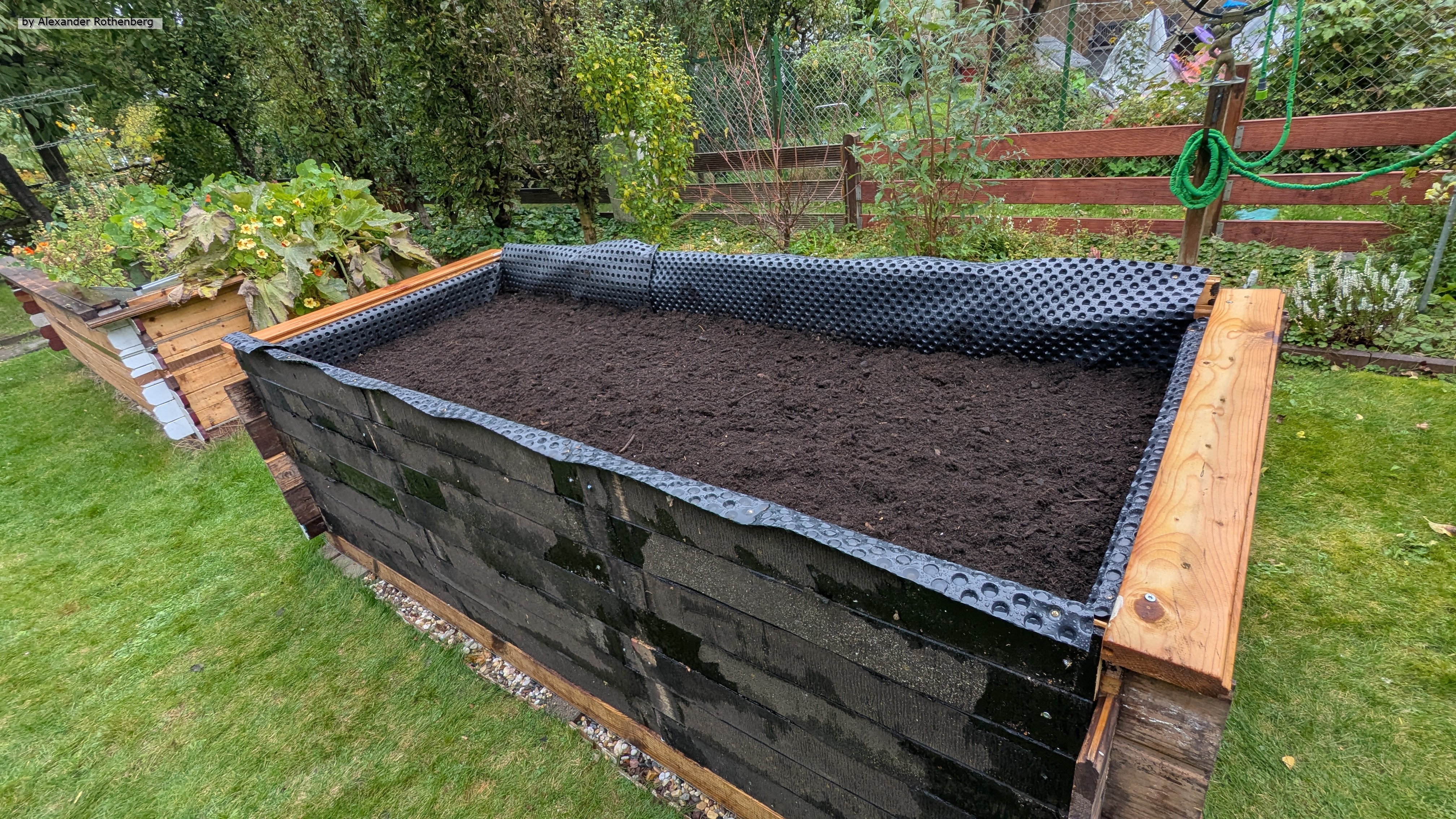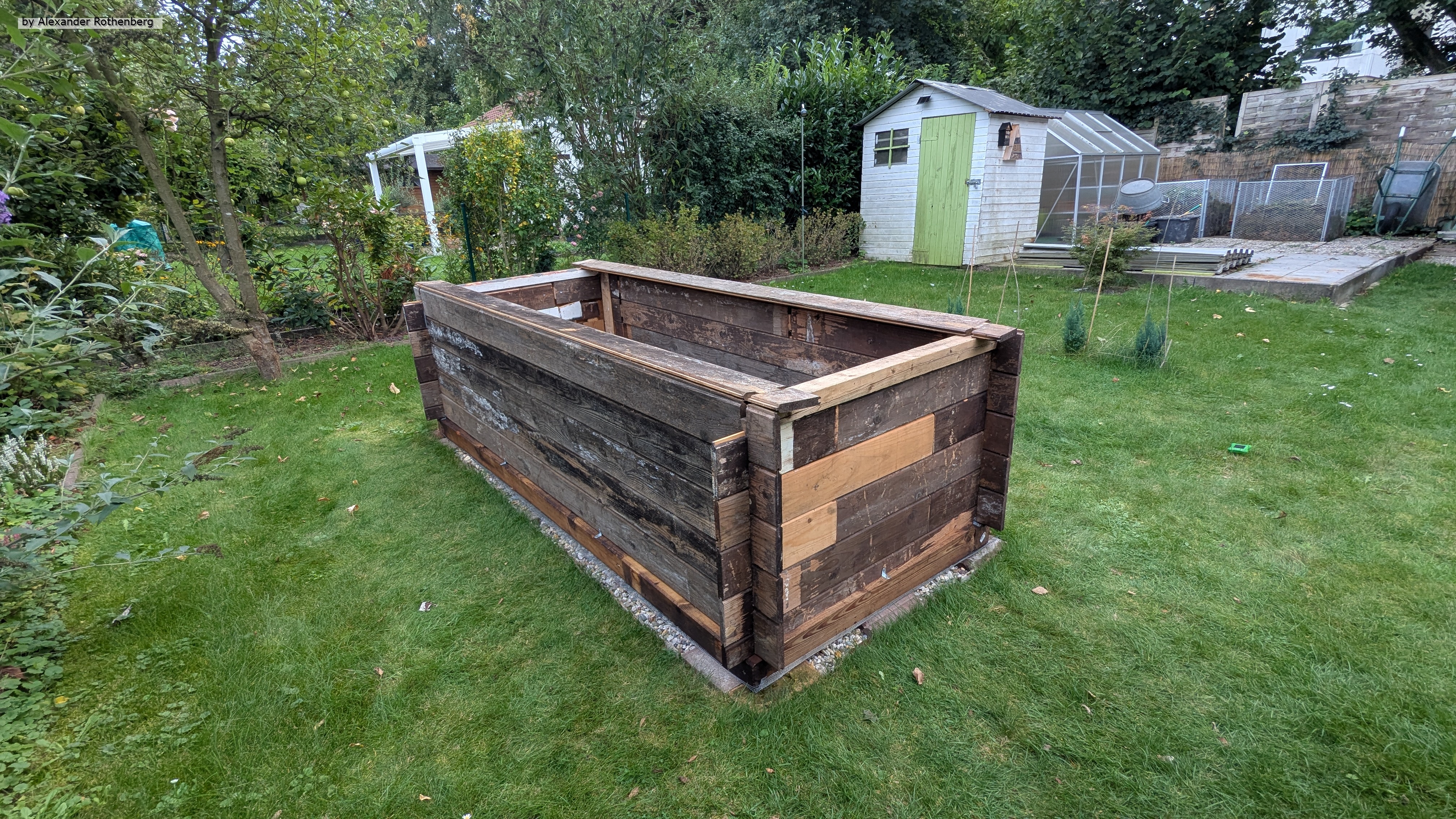 Da die äußere Holzwand aber schon deutliche Witterungsschäden aufwies, baute ich außen noch eine dritte Schicht aus witterungsbeständigen Dachlatten an. Diese waren bereits geteert und teilweise noch mit Dachpappe überzogen. Machte das Hochbeet jetzt nicht unbedingt hübscher aber hoffentlich langlebiger 😂.