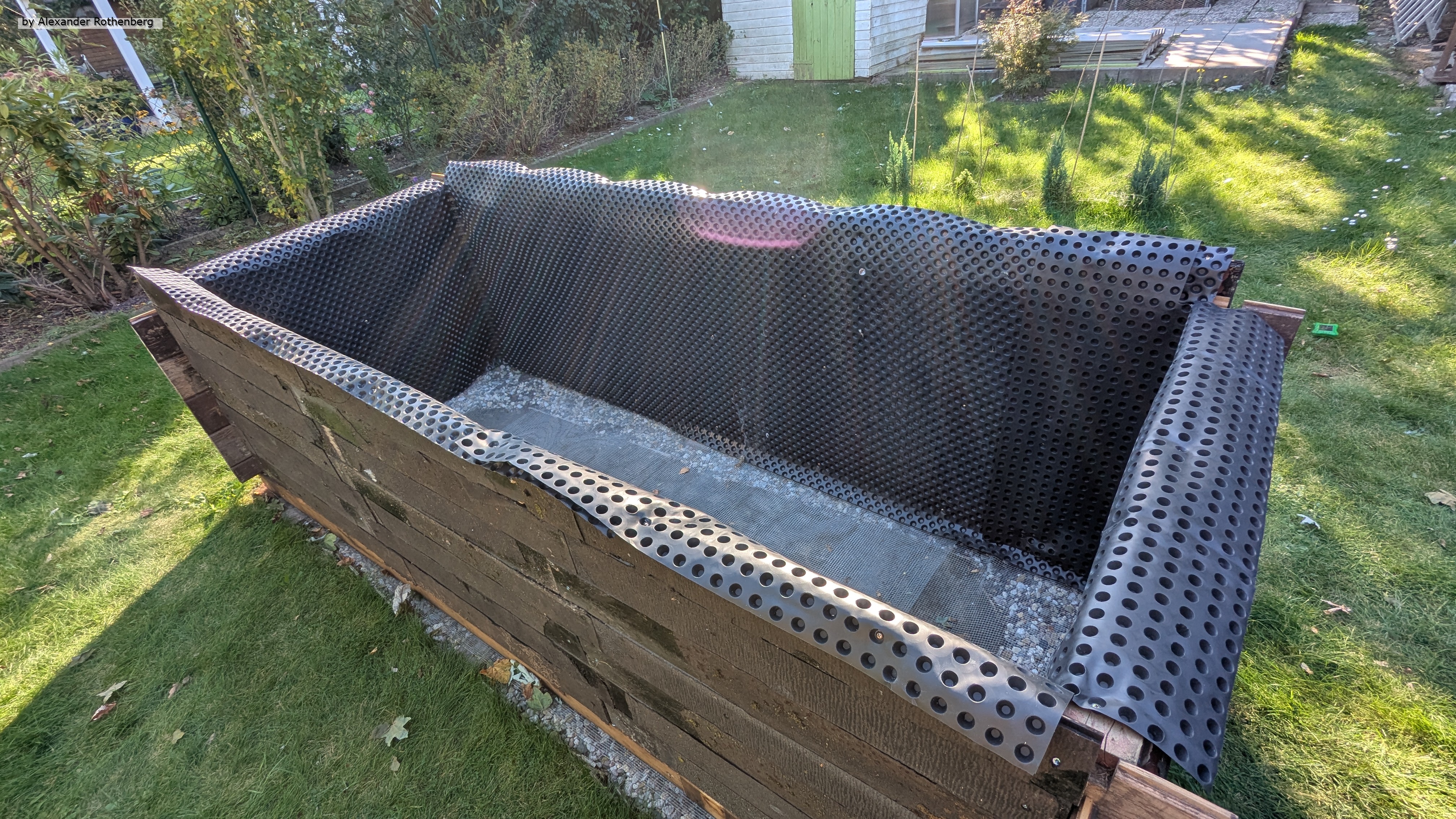 Als die Wand aus drei Schichten dann endlich abgeschlossen war, setzte ich die Noppenfolie ein und verschraubte sie in gleichmäßigen Abständen von innen an die Wand. Dieses Mal verzichtete ich darauf, den oberen Rand zu kürzen und klappte diesen einfach um. Die Wände waren ohnehin nur geringfügig kürzer als die Noppenfolie hoch war.