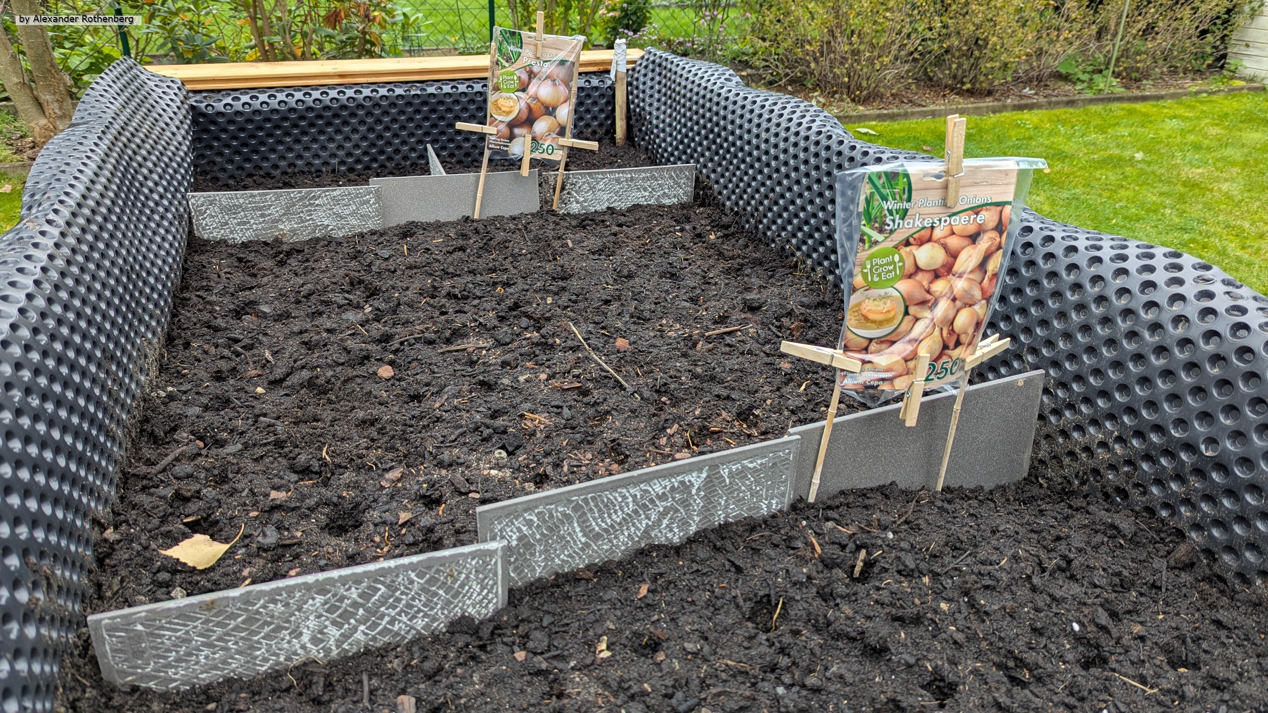 Nun war das Hochbeet gefüllt und konnte erstmals bepflanzt werden. Zu dem Zeitpunkt hatte ich mir noch nicht wirklich überlegt was man im Oktober aussähen könnte. Da sah ich zufällig ein Angebot für Wintersteckzwiebeln der Sorten Shakespeare und Presto und griff direkt zu. Diese kann man nämlich im Oktober einpflanzen und erhält dann ab April/Mai im Folgejahr ausgewachsene Speisezwiebeln falls alles klappt. Zusätzlich hatte ich noch Samen von Winterpostelein übrig und so fanden diese ebenfalls ihren Platz.